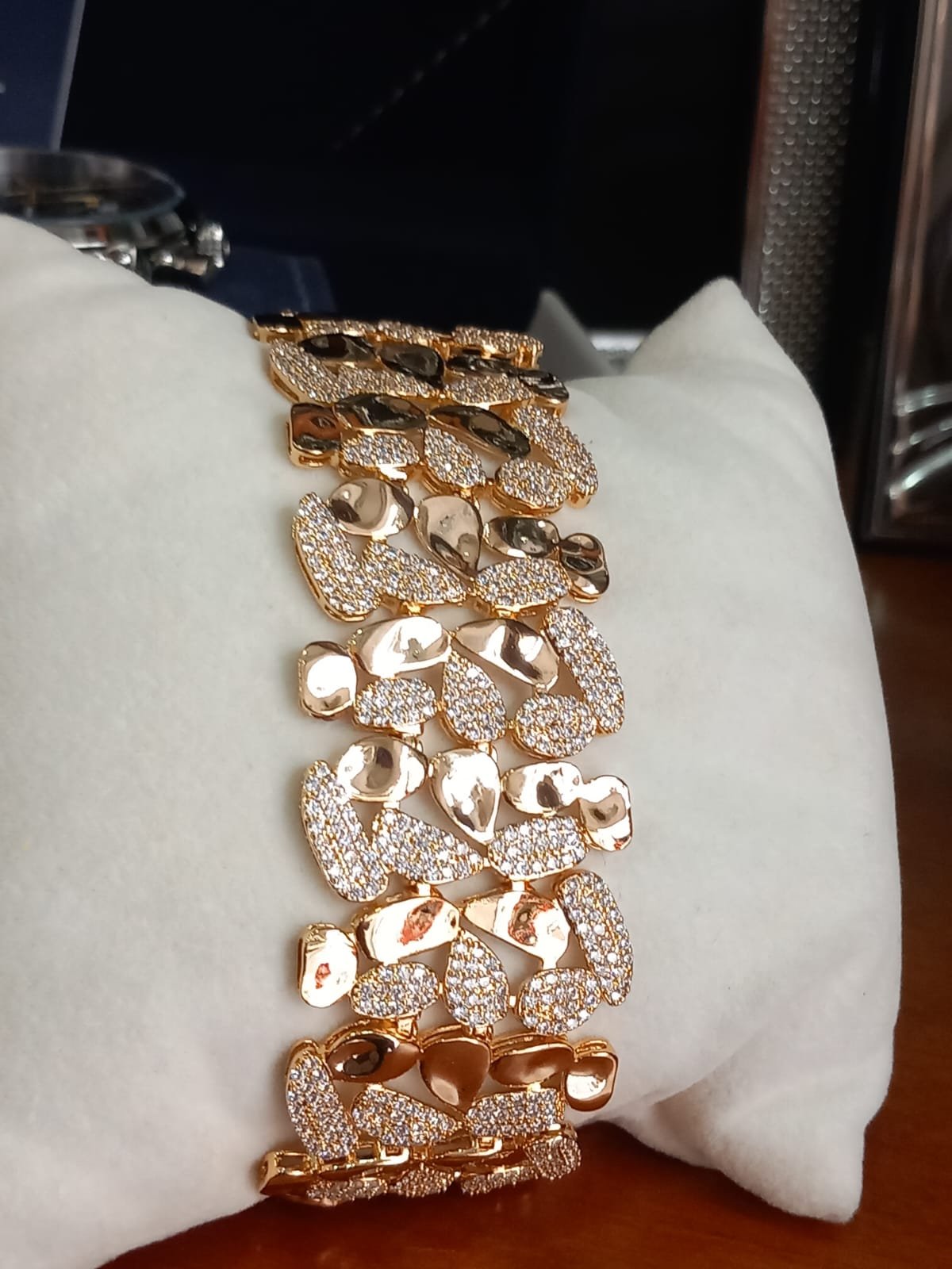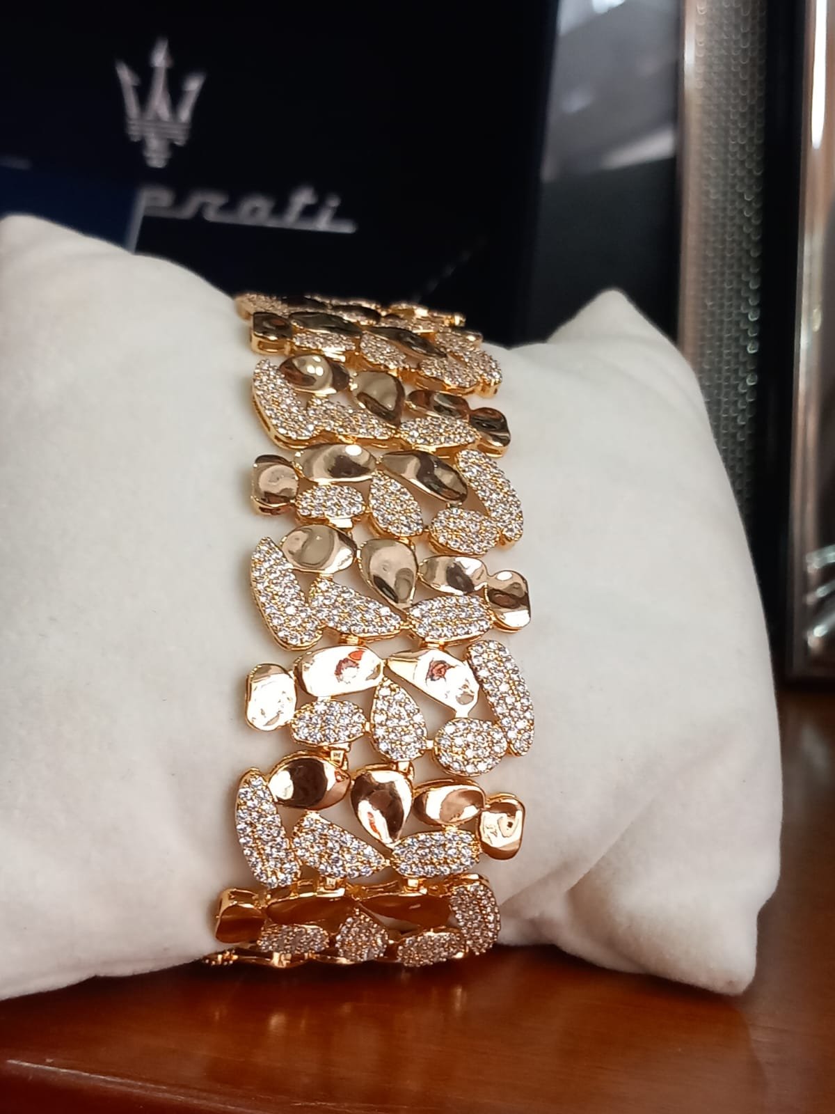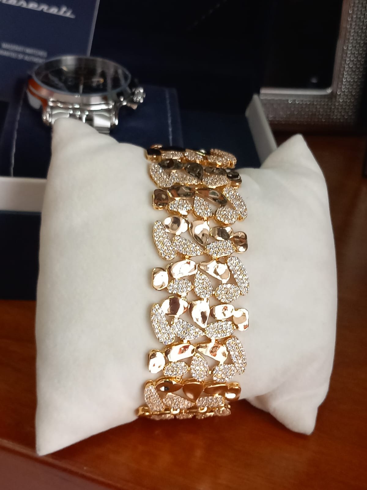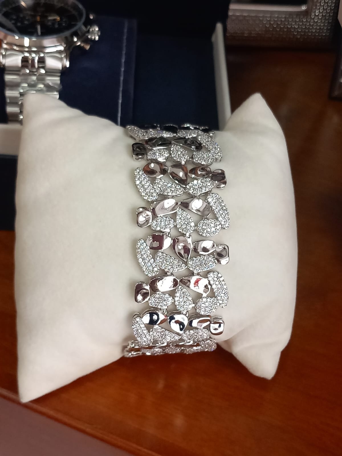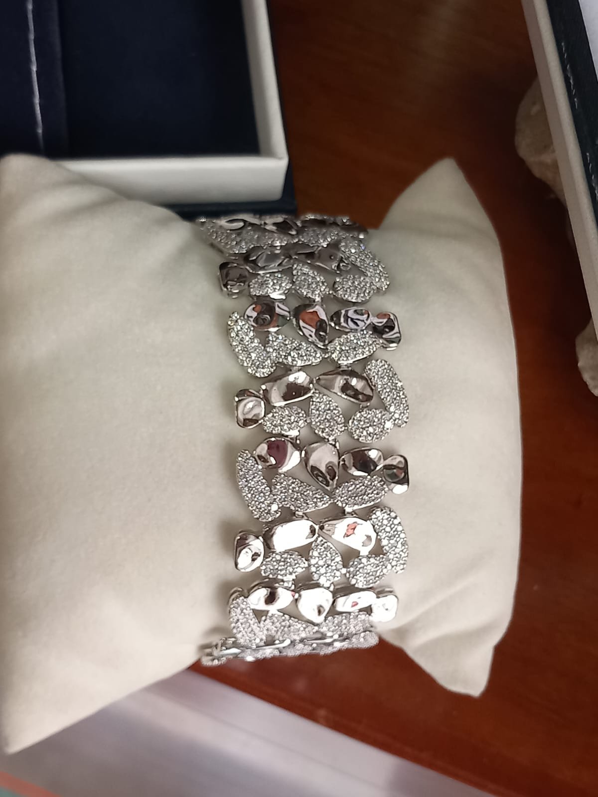 Questo elegante bracciale alla schiava è un gioiello scenografico e luminoso, pensato per chi ama distinguersi con stile. La struttura ampia è composta da elementi irregolari e scultorei, alternati a superfici ricoperte da un fitto pavé di zirconia che crea un raffinato gioco di luci.