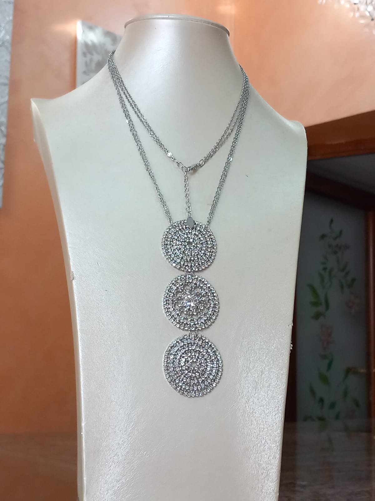 Un elegante laccio lungo in alta bigiotteria italiana, impreziosito da un pendente composto da tre cerchi ricoperti di zirconi luminosi.
